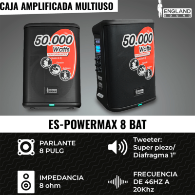 | • EAN: 1001404604824 • Referencia: ESPOWERMAX 8BAT • Código interno: 530100482 • ArtículoTipo: Parlante Activo • Nombre sugerido para ecommerce: «Parlante Activo ESPOWERMAX 8BAT 8 Pulgadas 100W RMS» • GS1: 7861226602408 |
