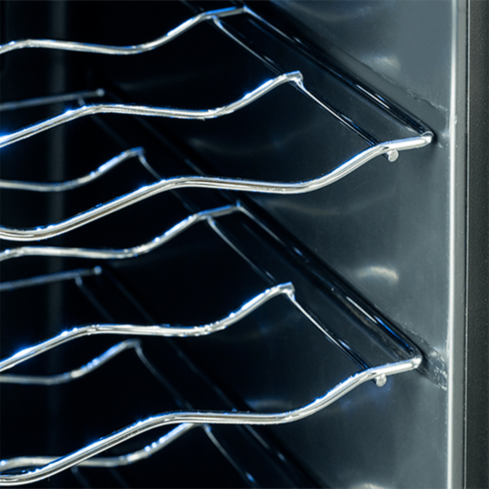 – Ofrece 4 parrillas de alambre cromado, con una capacidad de almacenamiento de hasta 8 botellas. Se recomienda colocar botellas de vino de 750 ml tipo Burdeos.